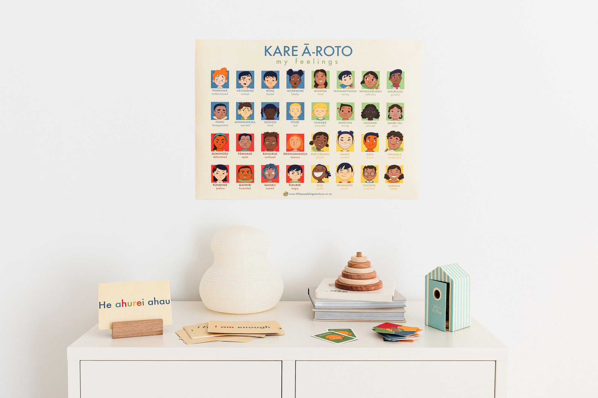 Place them at your child’s eye level, and decorate the area with soft toys, cushions or your child’s art to make it welcoming.